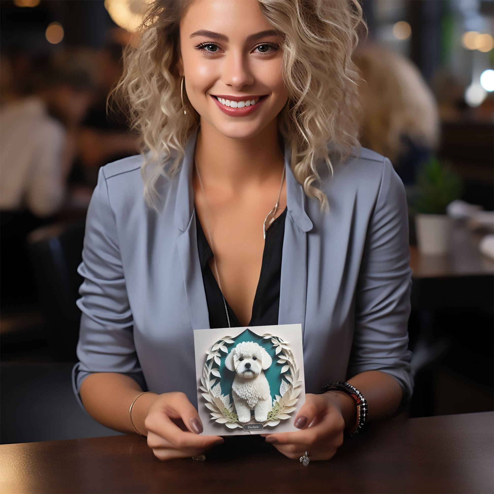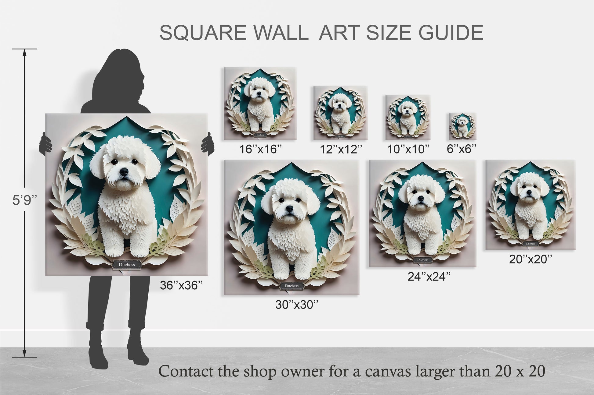 Celebrate the timeless elegance of the Bichon Frise with this papercut-inspired canvas print, featuring a poised white pup framed by delicate foliage on a rich green backdrop. Crafted to mimic layered paper art, this piece adds texture, charm, and sophistication to any dog lover’s décor. A standout gift or stylish addition to your gallery wall.