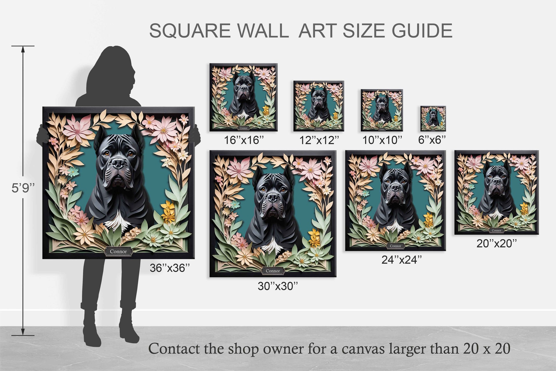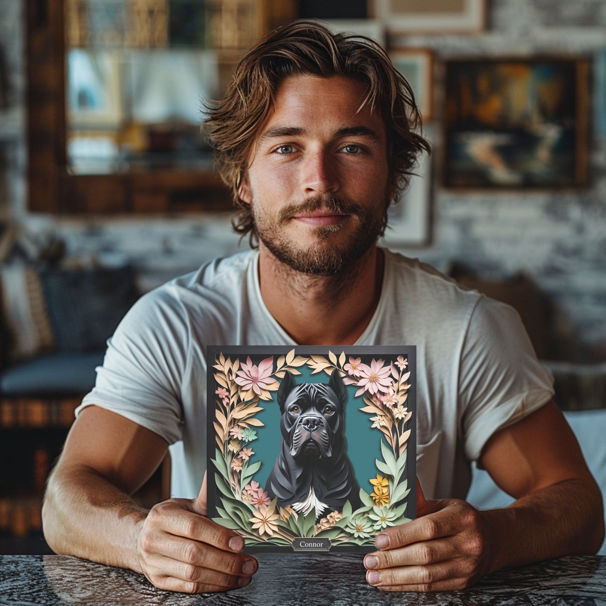 Honor the powerful presence and loyalty of the Cane Corso with this custom name canvas wall art, beautifully designed in faux paper-cut 3D illusion style. With its lifelike layered look and floral accents, this piece is a bold and heartfelt gift for any dog lover 🐾