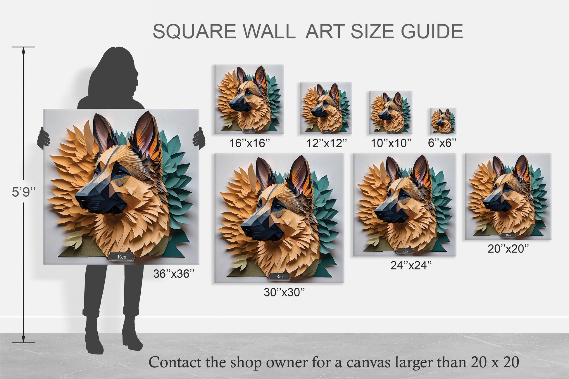 This stunning canvas print features a captivating geometric-style German Shepherd, intricately crafted with layered paper-like details in warm amber and soft green tones. The artistic depth and vibrant colors bring the majestic dog's loyalty and strength to life, making it a perfect statement piece for any home or office.
