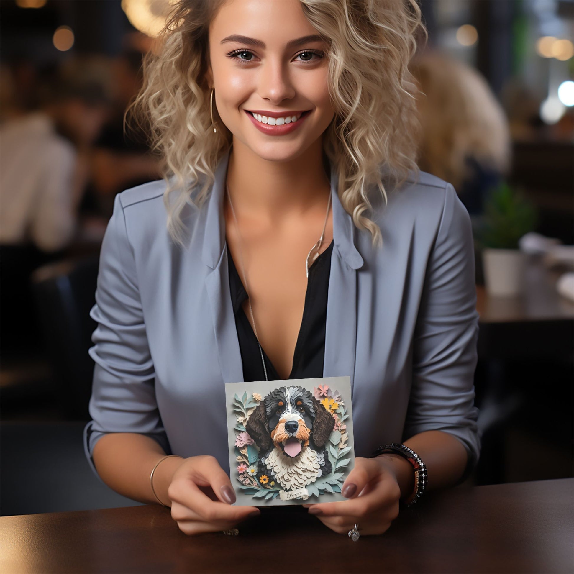 Celebrate your love for Bernedoodle with this personalized wall art featuring a faux paper-cut 3D-illusion style pet portrait. This unique design blends rustic charm with modern artistry, making it an ideal centerpiece for any home, office, or cabin décor.
