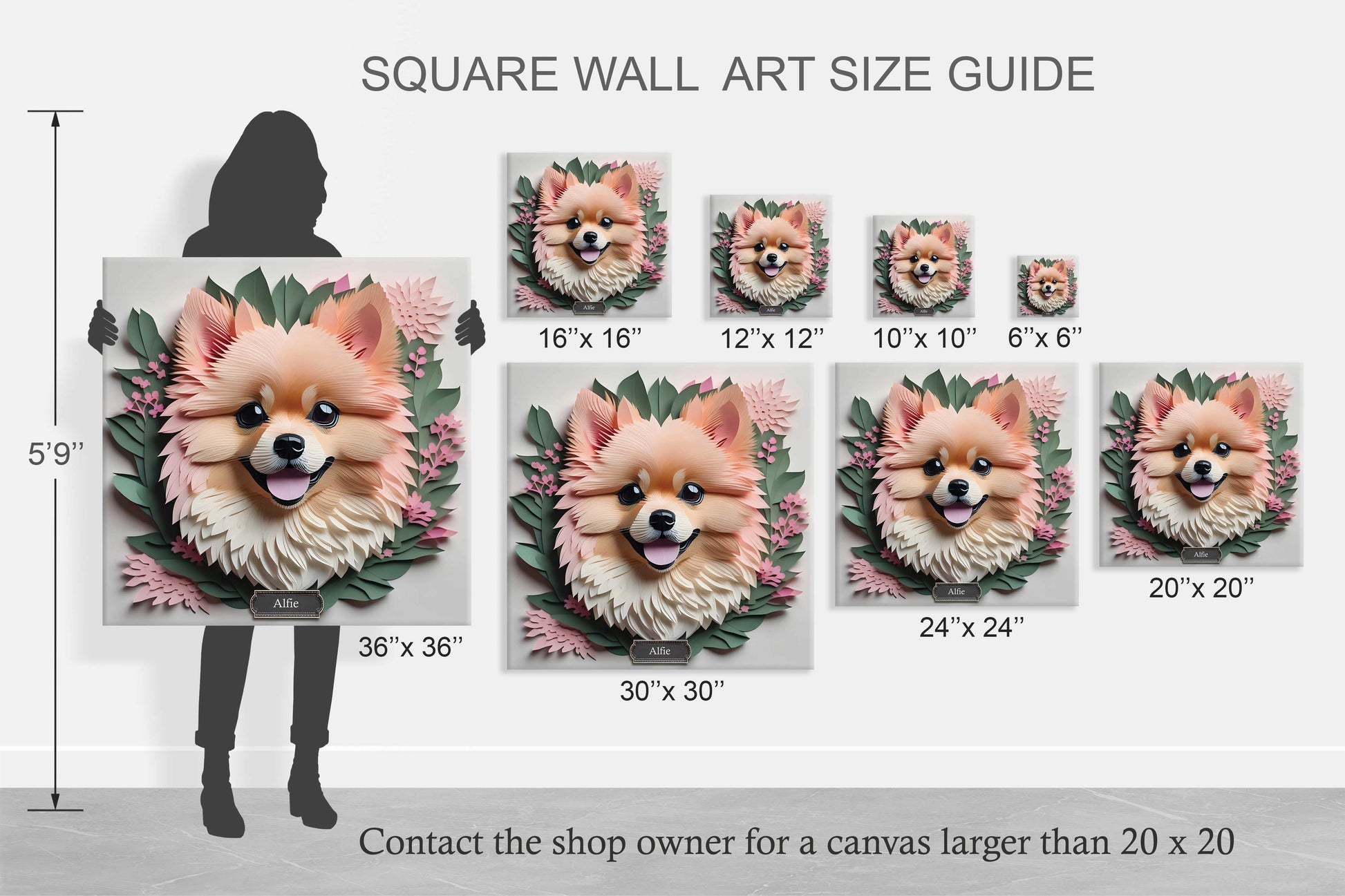 This floral-inspired faux papercut canvas highlights a happy Pomeranian framed by lush greenery and blush pink blossoms. The intricate layered style adds depth and artistry, giving the impression of hand-cut paper while being durable canvas wall art.